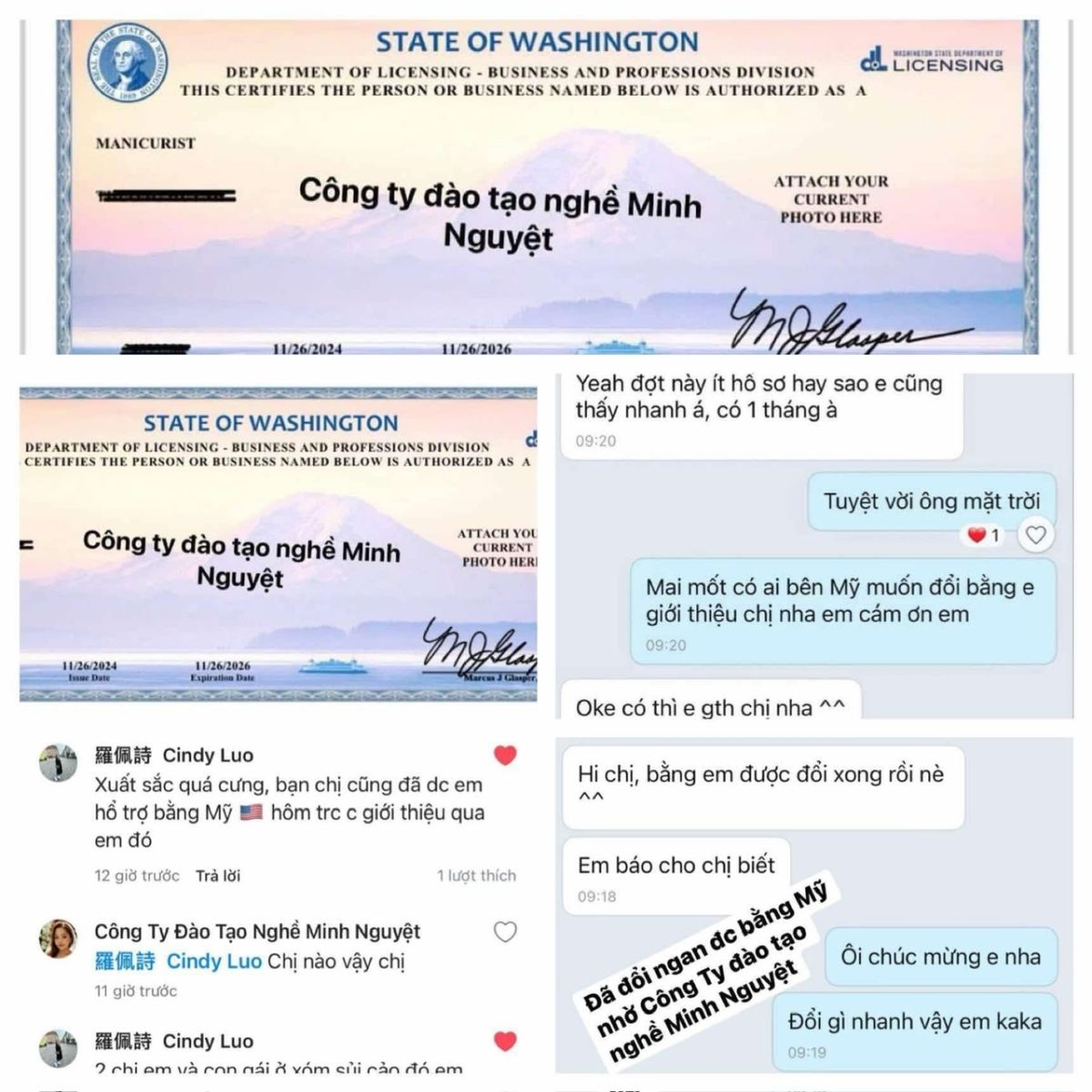 Theo chia sẻ từ học viên, quá trình làm hồ sơ diễn ra nhanh chóng, thủ tục rõ ràng và được hướng dẫn tận tình từ đội ngũ Minh Nguyệt. Chỉ sau khoảng 1 tháng, học viên đã hoàn tất việc đổi bằng và chính thức được cấp Chứng chỉ hành nghề Manicurist tại Bang Washington (Mỹ).